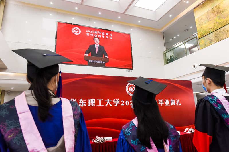 毕业典礼在校长曲景平的寄语视频中拉开帷幕。师生们安静驻足,专注聆听,“勤奋求实、励志明德”的华理精神伴随着曲校长的殷切期盼,再次深深根植在每一位华理人的心里。