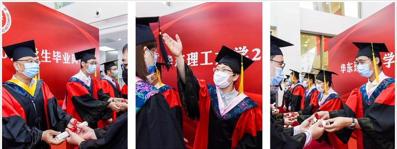 伴随着嘹亮奋进的音乐,导师在学子们的欢呼和掌声中依次入场,为2020届毕业生拨穗正冠,并赠送毕业纪念卷轴。从初入华理时的微凉初秋,到即将离港启航的炎炎盛夏,从海思路到梅陇路,千百个日日夜夜的学海奋斗都凝结在流苏被拨至左前方的一瞬间,成为毕业学子未来征程的珍贵行囊。