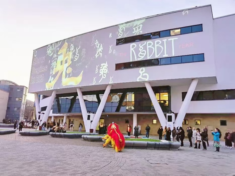 2023年2月,哈德斯菲尔德大学校园内,一场精彩的裸眼3D楼体秀吸引了校园内外的关注。该活动借助全息建筑投影技术和视觉融合系统,在大楼表面进行光影投射,构建了一个包含水墨画、中式传统建筑、汉字、皮影戏、元宵祈福等众多中国传统文化元素的虚拟场景。这场视觉盛宴在国内外社交媒体平台上的观看量达到20余万,点赞量1.3万余次,大大提升了中国文化在当地的影响力。